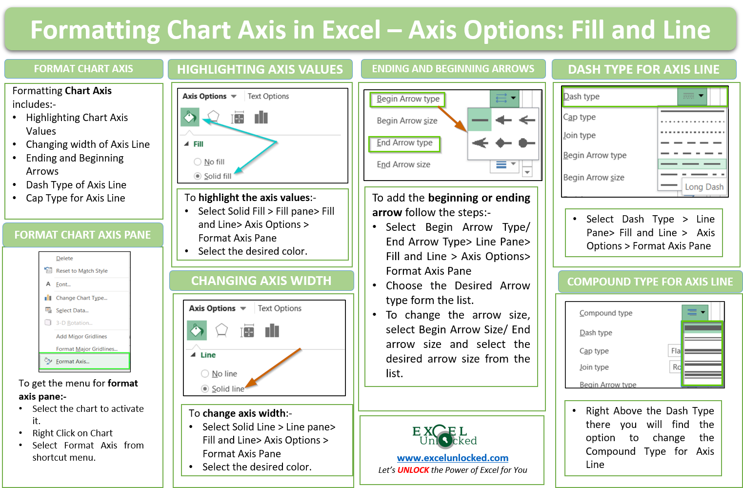 How to Change Horizontal Axis Values - Excel & Google Sheets Similar to what we did in Excel, we can do the same in Google Sheets. We'll start with the date on the X Axis and show how to change those values. Right click on the graph. Select Data Range. 3. Click on the box under X-Axis. 4. Click on the Box to Select a data range. 5. How to Add Axis Titles in Excel - EasyClick Academy First thing if you want to display the axis titles on a graph is to click anywhere within the graph area. Then click on the green plus sign located on the right-hand side of the graph. A list of chart elements rolls out. If you select the option 'Axis Titles', both horizontal and vertical axis titles appear in the graph area. Changing Axis Tick Marks (Microsoft Excel) Right-click on the axis whose tick marks you want to change. Excel displays a Context menu for the axis. Choose Format Axis from the Context menu. (If there is no Format Axis choice, then you did not right-click on an axis in step 1.) Excel displays the Format Axis task pane. Make sure the Axis Options tab is selected. (See Figure 1.) Figure 1.