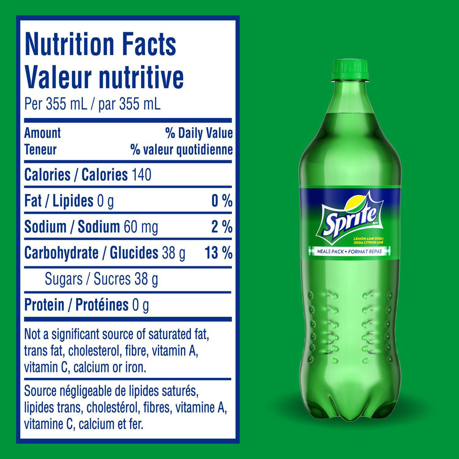 Sprite - 20 Fl Oz Bottle : Target Each 12 oz serving, or Sprite can, has 100 calories and 27g of sugar. Sprite is not a significant source of fat, trans fat, cholesterol, dietary fiber, vitamin D, calcium, iron and potassium. View nutrition label for complete Sprite nutrition facts & ingredient list. Introduced in 1961, Sprite is the world’s leading lemon-lime flavored soft ...