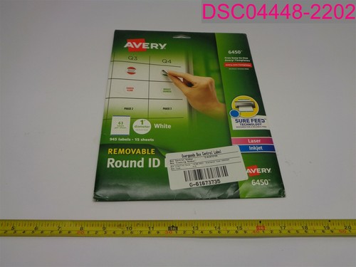 "Avery Removable Round Labels, 1-Inch Diameter, White, Pack of 945 (6450)" See details - Avery 6450 Removable Round 1" ID Labels - White - 945 Labels - New . See all 4 brand new listings. Qty. Buy It Now. Add to cart. Watch. Sold by north_tx_star 99.7% Positive feedback Contact seller. About this product. Product Identifiers. Brand. Avery. GTIN. 0072782064501. UPC. 0072782064501.