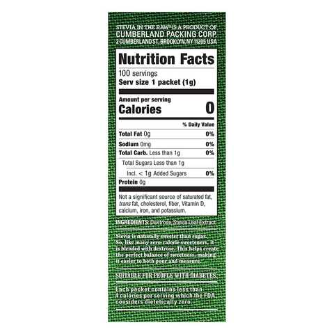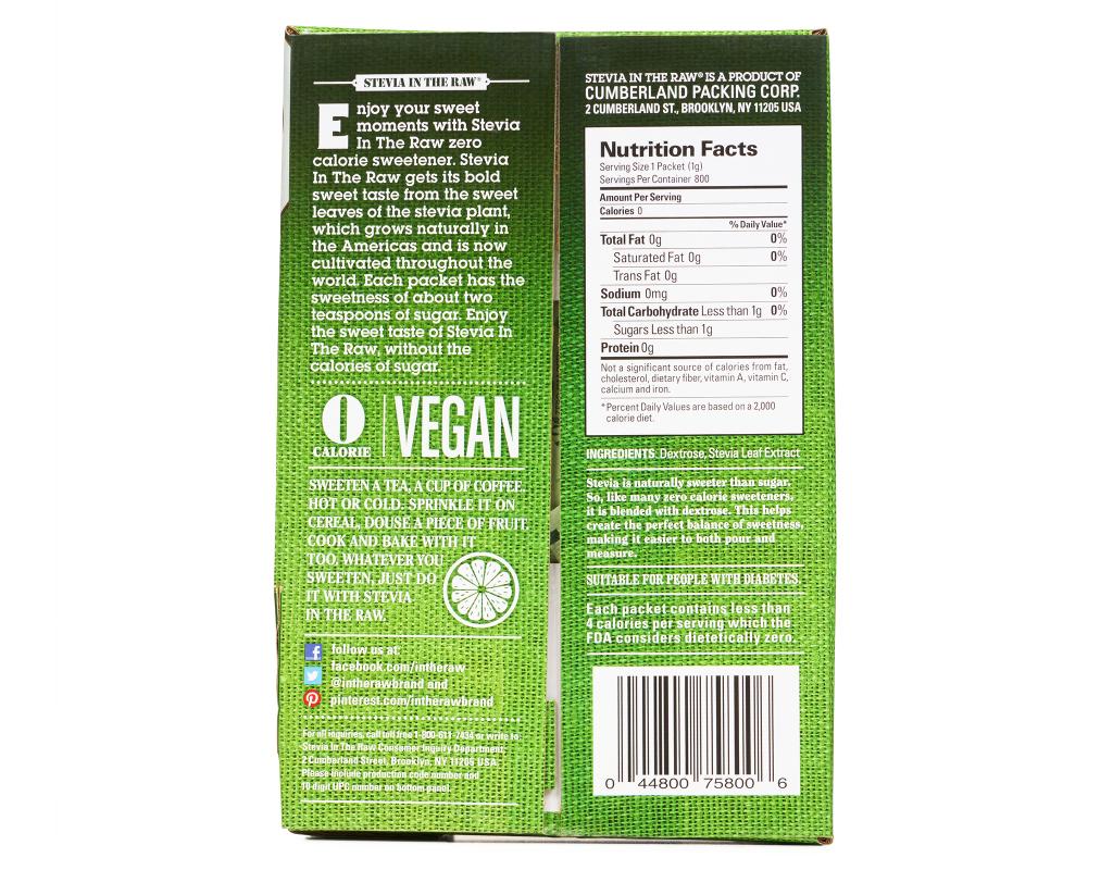 Stevia In The Raw® Packets | In The Raw® Sweeteners Stevia In The Raw® Packets. 30 ct / 50 ct / 100 ct / 250 ct / 400 ct / 800 ct. Enjoy your sweet moments with Stevia In The Raw® zero-calorie* sweetener. It's an extract from the sweet leaves of the stevia plant. The delicious flavor comes without any calories. So go on, sweeten a tea, hot or cold, sprinkle it on cereal. Bake and cook with it too. Stevia In The Raw Calories 0. % Daily Value. Fat 0 g. 0%. Carbohydrate 1 g. 0%. Sugars 1 g. Protein 0 g. Not a significant source of saturated fat, trans fat, cholesterol, sodium, fat, vitamin A, vitamin C, calcium or iron. Stevia vs. Sugar: Nutrition Facts, Calories, Carbs, and More - Healthline Stevia is a sugar alternative extracted from the leaves of the Stevia rebaudiana plant. These leaves have been enjoyed for their sweetness and used as an herbal medicine to treat high blood sugar... Ranking the best stevia of 2021 - Body Nutrition 9. Stevia in the Raw. Check price at Amazon. Stevia in the Raw is popular and well-liked, but it is not the most pure stevia extract on the market. It uses a combination of maltodextrin and stevia extract, which means the powder is somewhat less sweet and more blandly flavored than a pure stevia. 10. KAL Sure Stevia. Check price at Amazon