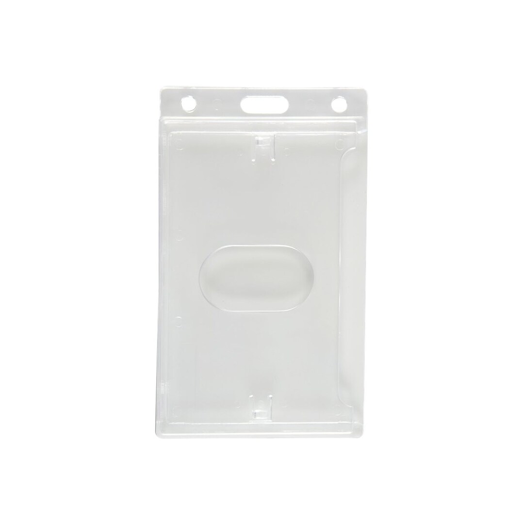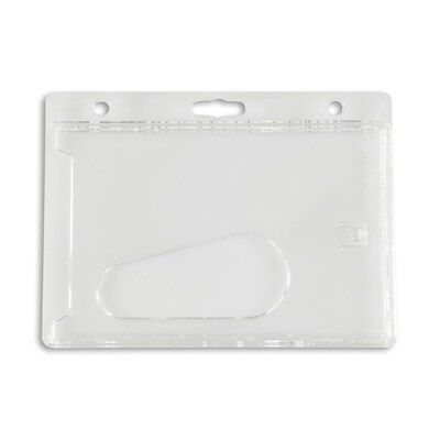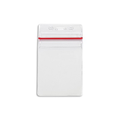 IDville ID Badge Holders, Clear with Red Stripe, 50/Pack (45234) These IDville vertical clear ID badge holders come in a pack of 50 units. Fasten this ID badge holder to clothing, bags, and more to keep your hands free Two convenient ways to attach badge, use with cord or clip Insert your ID card in the sealable pocket Size: 3"W x 4 7/8"L Comes in a pack of 50 ID badge holders Made from vinyl for durability