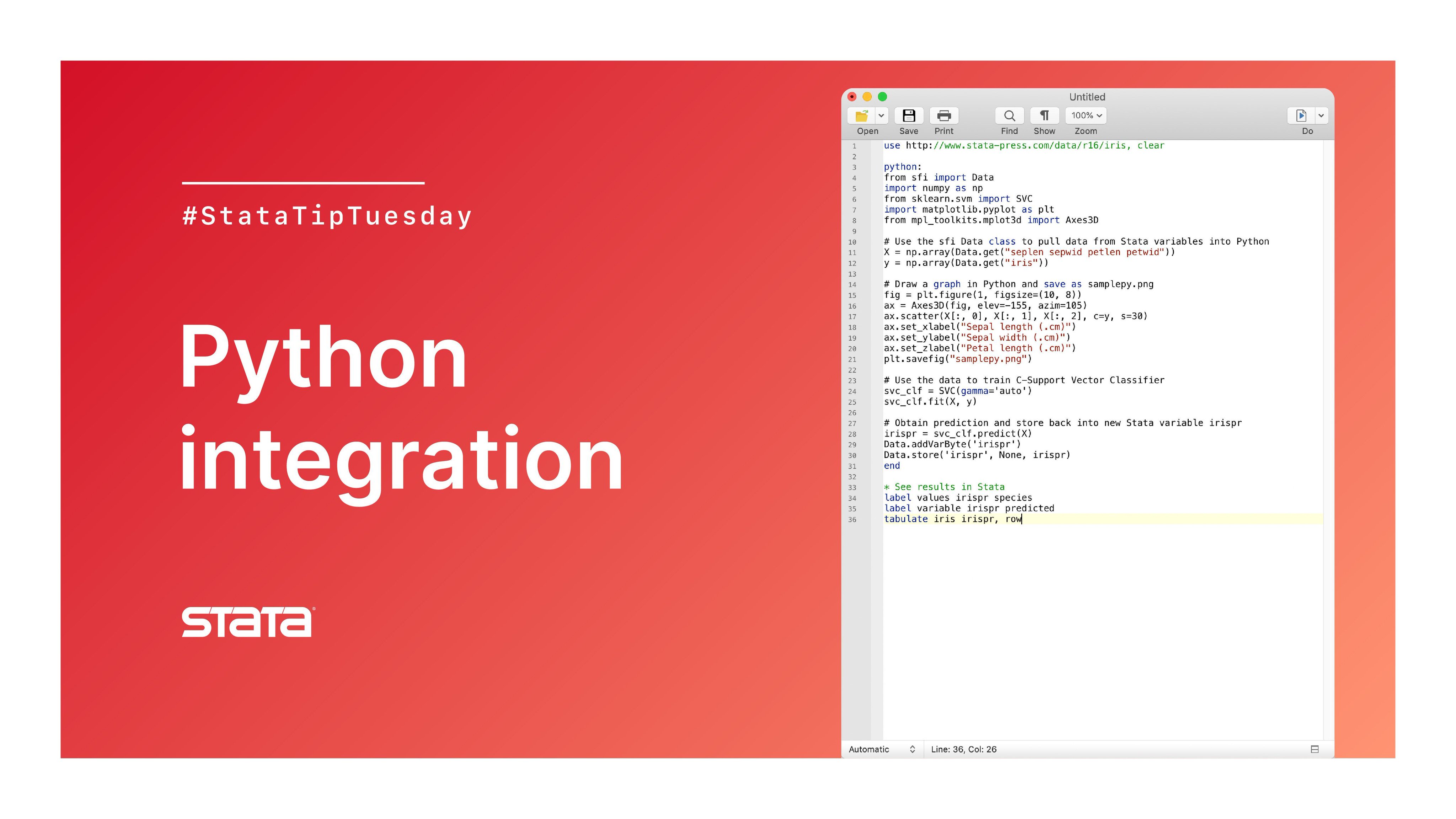 Jupyter Notebook with Stata | New in Stata 17 16.11.2022 · Next, we load Python data into Stata, perform analyses in Stata, and then pass Stata returned results to Python for further analysis, using the Second National Health and Nutrition Examination Survey (NHANES II; McDowell et al. 1981). NHANES II, a dataset concerning health and nutritional status of adults and children in the US, contains 10,351 …