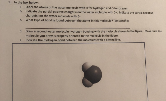 PDF CHEMISTRY OF WATER WORKSHEET - Loudoun County Public Schools Chemistry of Water 1 CHEMISTRY OF WATER WORKSHEET Polar Molecules and Hydrogen Bonding 1. The drawing here represents a water molecule. Label the oxygen and hydrogen atoms in this molecule: 2. You should have some water molecules on your table. Note that the colors used for each of